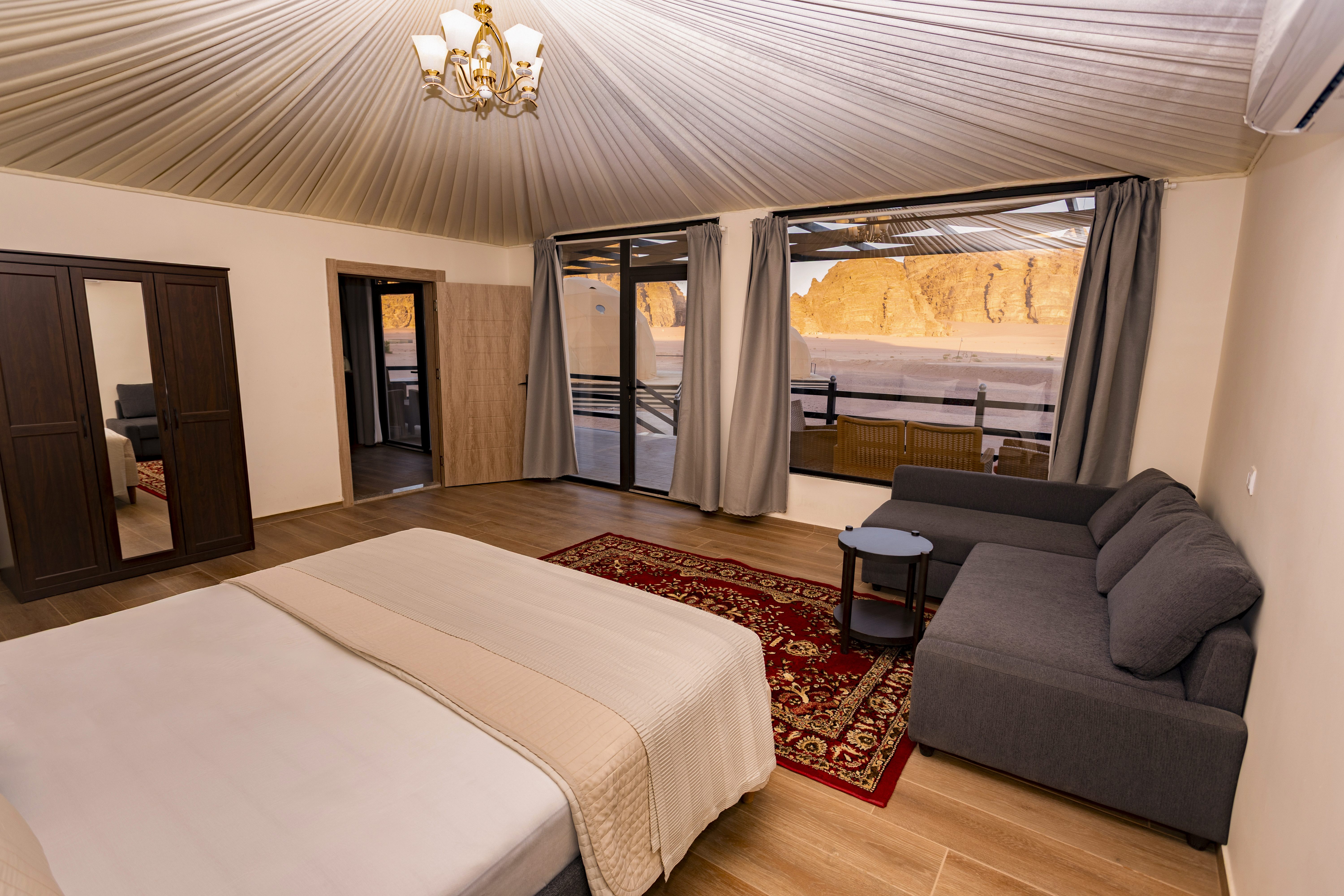 Our most spacious single-room retreat, the Grand Tent offers an immersive desert experience with floor-to-ceiling windows that frame Wadi Rum’s vast landscape. An indoor seating area provides a peaceful space to unwind, balancing comfort and simplicity. Designed for those who appreciate tranquility, this tent invites you to slow down and embrace the desert’s rhythm.